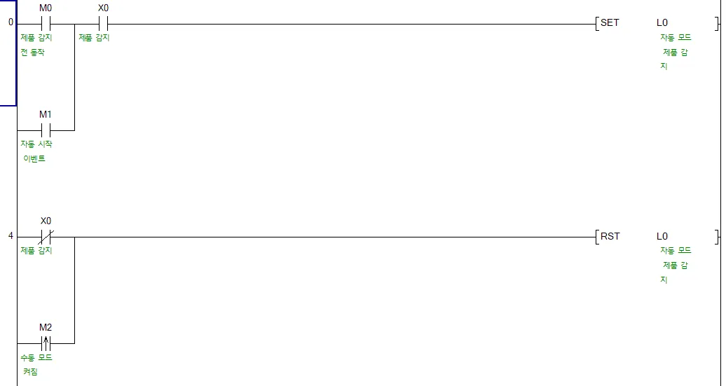 그 다음 제품 감지 센서(X0)가 켜지면 제품이 자동으로 넘어왔다는 L0을 SET 한다.